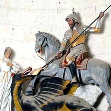 La mise en scène assez complexe du groupe de saint Georges — le cavalier vole au secours de la princesse, vêtue en bergère, que menace un terrible dragon — préfigure les aptitudes théâtrales des grands groupes du siècle suivant. Mais la naïveté de son exécution et son caractère narratif relèvent encore d’un archaïsme certain. Par la suite, l’Église proscrira les représentations animale et saint Georges sera représenté de manière moins narrative, figurant debout avec armes et armure, comme à Saint-Georges-du-Plain et à Bouloire, dans des œuvres datant de la fin du XVIIe siècle. À Brette-les-Pins, la statue d’un autre cavalier, vestige d’une Charité de saint Martin dont le pauvre a disparu, manifeste beaucoup de points communs avec le Saint Georges, au point d’en suggérer également l’attribution à Dionise.
